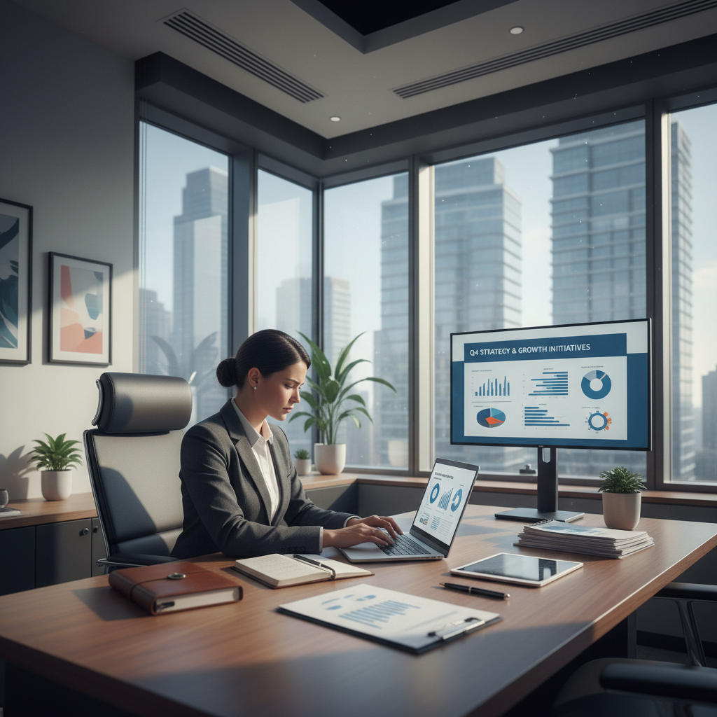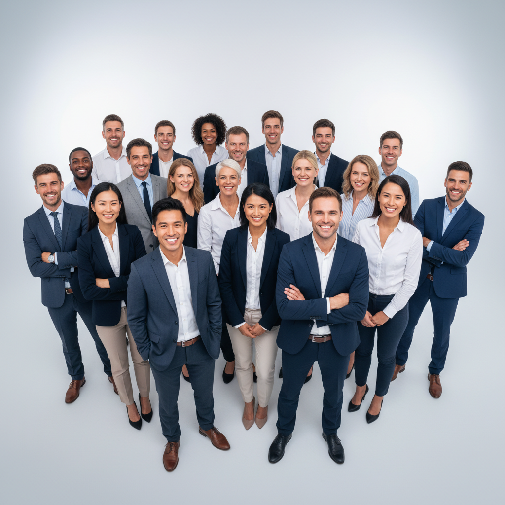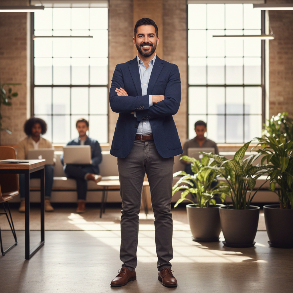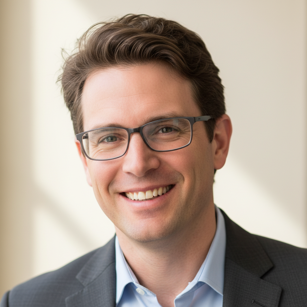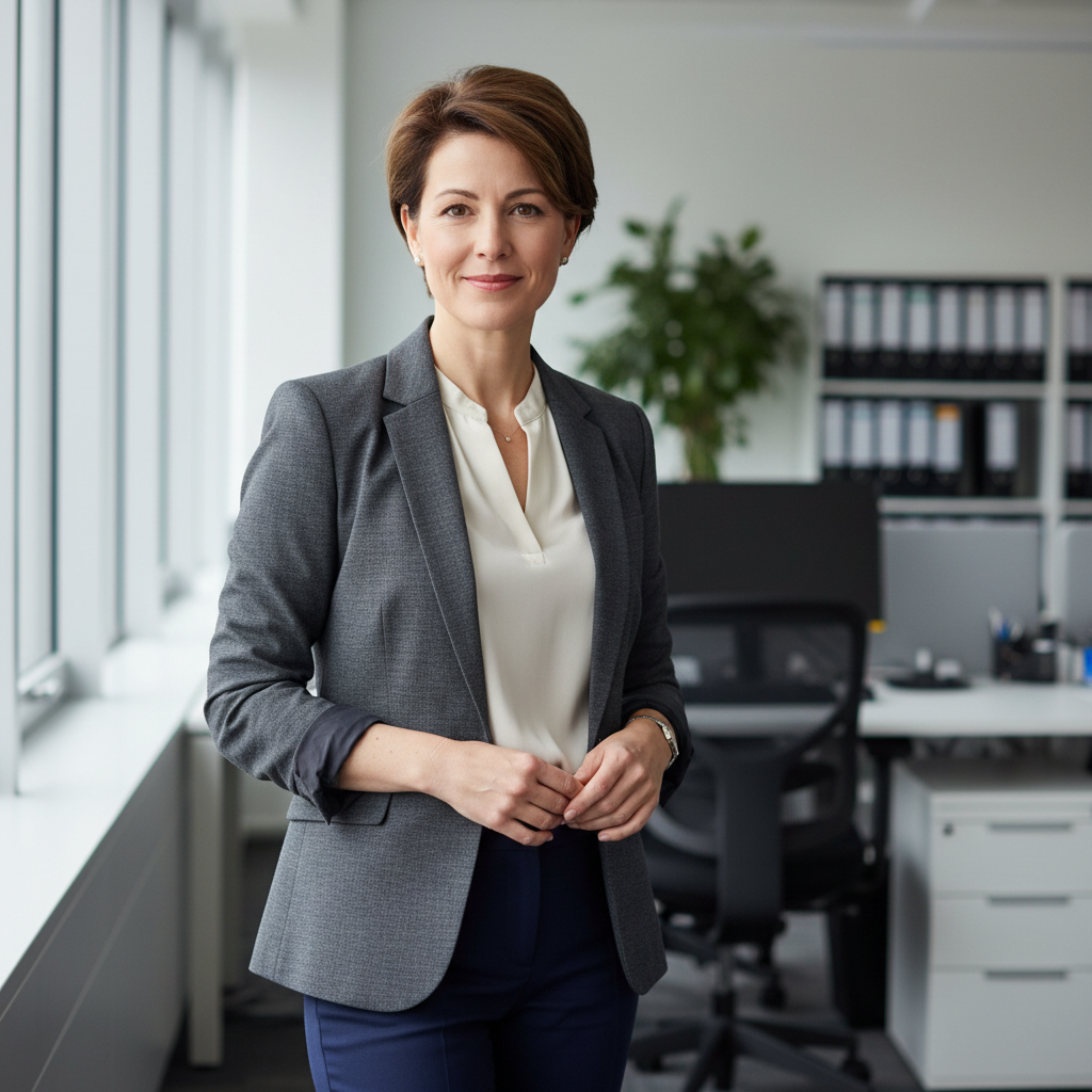 Business professional in suit smiling at cameraFemale executive with glasses in office settingMale manager in business casual attire